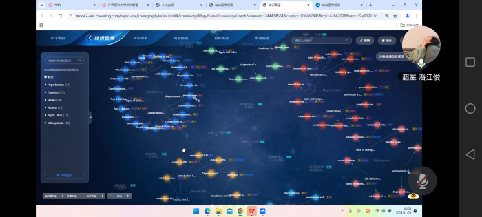 超星公司的项目负责介绍了三门课程知识图谱建设总体进展情况,相关工作人员现场演示了《医学口译》、《医学英语翻译实践创新》和《综合医学英语》三门课程的图谱体系,展示了专业课程建设思政点、实践点、知识点等内容以及课程之间的关联性与重复度,演示了不同课程知识图谱、问题图谱、能力图谱等方面内容。