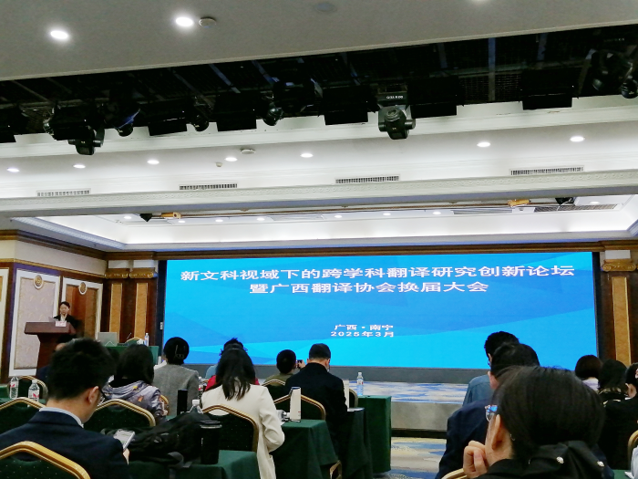 2025年3月22日,广西翻译协会在南宁举办新文科视域下的跨学科翻译研究创新论坛暨换届大会。sunbet申搏经理周秀琼、党委书记韦建辉、副经理吕晓敏、公司教师代表及翻译专业硕士研究生代表共30人参加了此次活动。